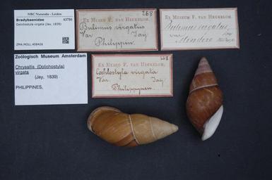 | Keywords: Naturalis Biodiversity Center - ZMA.MOLL.408426 - Dolichostyla virgata (Jay, 1839) - Bradybaenidae - Mollusc shell.jpeg  artwork Dimensions artwork Document type Bradybaenidae Dolichostyla Individual count Infraspecific epithet Infraspecific rank Institution Naturalis Kind of unit artwork Kind of unit specimen shell Life stage Medium artwork Nomenclatural code Source institute Zoölogisch Museum Amsterdam Scale the width of the text on the species/QR-code label is 38 mm Occurrence ID page Other fields Other versions artwork Permission license Naturalis donation CC-0 Mollusca Publication location Scientific name Dolichostyla virgata Jay 1839 Scientific name authorship Jay 1839 Source url http //bioportal naturalis nl Specific epithet virgata State or province Subject keywords artwork Subject keywords publication Title artwork Title publication Type status Uploaded with GWToolset Naturalis_Biodiversity_Center_-_ZMA MOLL 408426_-_Dolichostyla_virgata_ Jay _1839 _-_Bradybaenidae_-_Mollusc_shell http //medialib naturalis nl/file/id/ZMA MOLL 408426/format/large Molluscs at Naturalis from the Zoölogisch Museum Amsterdam Media donated by Naturalis Biodiversity Center Dolichostyla virgata Dolichostyla |