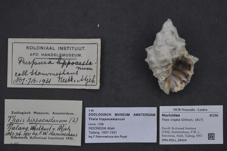 | Keywords: Naturalis Biodiversity Center - ZMA.MOLL.28424 - Thais virgata (Dillwyn, 1817) - Muricidae - Mollusc shell.jpeg  artwork Dimensions artwork Document type Muricidae subfamily Rapaninae Thais Individual count Infraspecific epithet Infraspecific rank Institution Naturalis Kind of unit artwork Kind of unit specimen shell Life stage Indonesia Atjeh Tjalang 1857-1931 Medium artwork Nomenclatural code Scale the width of the text on the species/QR-code label is 38 mm Occurrence ID page Neogastropoda Other fields Other versions artwork Permission license Naturalis donation CC-0 Mollusca Publication location Scientific name Thais virgata Dillwyn 1817 Scientific name authorship Dillwyn 1817 Source url http //bioportal naturalis nl Specific epithet virgata State or province Atjeh Subject keywords artwork Subject keywords publication Title artwork Title publication Type status Uploaded with GWToolset Naturalis_Biodiversity_Center_-_ZMA MOLL 28424_-_Thais_virgata_ Dillwyn _1817 _-_Muricidae_-_Mollusc_shell http //medialib naturalis nl/file/id/ZMA MOLL 28424/format/large Media donated by Naturalis Biodiversity Center Molluscs at Naturalis from the Zoölogisch Museum Amsterdam Thais virgata |