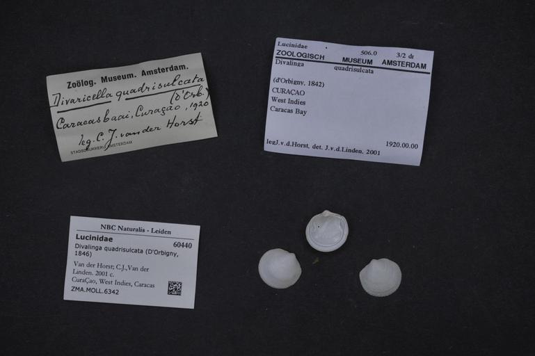 | Keywords: Naturalis Biodiversity Center - ZMA.MOLL.6342 - Divalinga quadrisulcata (D'Orbigny, 1846) - Lucinidae - Mollusc shell.jpeg artwork Dimensions artwork Document type Lucinidae subfamily Divaricellinae Divalinga Individual count Infraspecific epithet Infraspecific rank Institution Naturalis Kind of unit artwork Kind of unit specimen shell Life stage Curaçao West Indies Caracas Bay; 1920 Medium artwork Nomenclatural code Source institute Zoölogisch Museum Amsterdam Scale the width of the text on the species/QR-code label is 38 mm Occurrence ID page Other fields Other versions artwork Permission license Naturalis donation CC-0 Mollusca Publication location Scientific name Divalinga quadrisulcata D'Orbigny 1846 Scientific name authorship D'Orbigny 1846 Source url http //bioportal naturalis nl Specific epithet quadrisulcata State or province Curaçao Subject keywords artwork Subject keywords publication Title artwork Title publication Type status Uploaded with GWToolset Naturalis_Biodiversity_Center_-_ZMA MOLL 6342_-_Divalinga_quadrisulcata_ D'Orbigny _1846 _-_Lucinidae_-_Mollusc_shell http //medialib naturalis nl/file/id/ZMA MOLL 6342/format/large Molluscs at Naturalis from the Zoölogisch Museum Amsterdam Media donated by Naturalis Biodiversity Center Divalinga quadrisulcata Divalinga |