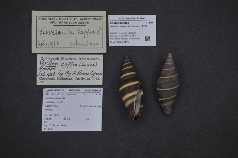| Keywords: Naturalis Biodiversity Center - ZMA.MOLL.72191 - Vexillum vulpecula (Linnaeus, 1758) - Costellariidae - Mollusc shell.jpeg artwork Dimensions artwork Document type Costellariidae Vexillum Individual count Infraspecific epithet Infraspecific rank Institution Naturalis Kind of unit artwork Kind of unit specimen shell Life stage Indonesia Maluku Moluccas Amboina; lat -2 38 lon 128 12; 1920 Medium artwork Nomenclatural code Collection remarks Moll Source institute Zoölogisch Museum Amsterdam Scale the width of the text on the species/QR-code label is 38 mm Occurrence ID page Neogastropoda Other fields Other versions artwork Permission license Naturalis donation CC-0 Mollusca Publication location Scientific name Vexillum vulpecula Linnaeus 1758 Scientific name authorship Linnaeus 1758 Source url http //bioportal naturalis nl Specific epithet vulpecula State or province Maluku Moluccas Subject keywords artwork Subject keywords publication Title artwork Title publication Type status Uploaded with GWToolset Naturalis_Biodiversity_Center_-_ZMA MOLL 72191_-_Vexillum_vulpecula_ Linnaeus _1758 _-_Costellariidae_-_Mollusc_shell http //medialib naturalis nl/file/id/ZMA MOLL 72191/format/large Molluscs at Naturalis from the Zoölogisch Museum Amsterdam Media donated by Naturalis Biodiversity Center Vexillum vulpecula Vexillum |