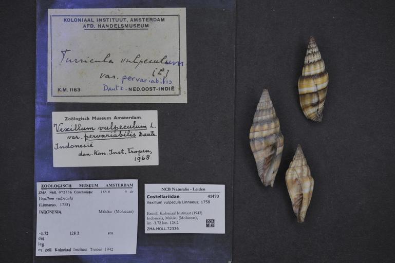 | Keywords: Naturalis Biodiversity Center - ZMA.MOLL.72336 - Vexillum vulpecula (Linnaeus, 1758) - Costellariidae - Mollusc shell.jpeg artwork Dimensions artwork Document type Costellariidae Vexillum Individual count Infraspecific epithet Infraspecific rank Institution Naturalis Kind of unit artwork Kind of unit specimen shell Life stage Indonesia Maluku Moluccas lat -3 72 lon 128 2 Medium artwork Nomenclatural code Collection remarks Moll Source institute Zoölogisch Museum Amsterdam Scale the width of the text on the species/QR-code label is 38 mm Occurrence ID page Neogastropoda Other fields Other versions artwork Permission license Naturalis donation CC-0 Mollusca Publication location Scientific name Vexillum vulpecula Linnaeus 1758 Scientific name authorship Linnaeus 1758 Source url http //bioportal naturalis nl Specific epithet vulpecula State or province Maluku Moluccas Subject keywords artwork Subject keywords publication Title artwork Title publication Type status Uploaded with GWToolset Naturalis_Biodiversity_Center_-_ZMA MOLL 72336_-_Vexillum_vulpecula_ Linnaeus _1758 _-_Costellariidae_-_Mollusc_shell http //medialib naturalis nl/file/id/ZMA MOLL 72336/format/large Molluscs at Naturalis from the Zoölogisch Museum Amsterdam Media donated by Naturalis Biodiversity Center Vexillum vulpecula Vexillum |