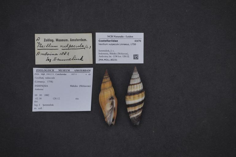 | Keywords: Naturalis Biodiversity Center - ZMA.MOLL.80231 - Vexillum vulpecula (Linnaeus, 1758) - Costellariidae - Mollusc shell.jpeg artwork Dimensions artwork Document type Costellariidae Vexillum Individual count Infraspecific epithet Infraspecific rank Institution Naturalis Kind of unit artwork Kind of unit specimen shell Life stage Indonesia Maluku Moluccas Amboina; lat -2 38 lon 128 12; 1882 Medium artwork Nomenclatural code Collection remarks Moll Source institute Zoölogisch Museum Amsterdam Scale the width of the text on the species/QR-code label is 38 mm Occurrence ID page Neogastropoda Other fields Other versions artwork Permission license Naturalis donation CC-0 Mollusca Publication location Scientific name Vexillum vulpecula Linnaeus 1758 Scientific name authorship Linnaeus 1758 Source url http //bioportal naturalis nl Specific epithet vulpecula State or province Maluku Moluccas Subject keywords artwork Subject keywords publication Title artwork Title publication Type status Uploaded with GWToolset Naturalis_Biodiversity_Center_-_ZMA MOLL 80231_-_Vexillum_vulpecula_ Linnaeus _1758 _-_Costellariidae_-_Mollusc_shell http //medialib naturalis nl/file/id/ZMA MOLL 80231/format/large Molluscs at Naturalis from the Zoölogisch Museum Amsterdam Media donated by Naturalis Biodiversity Center Vexillum vulpecula Vexillum |