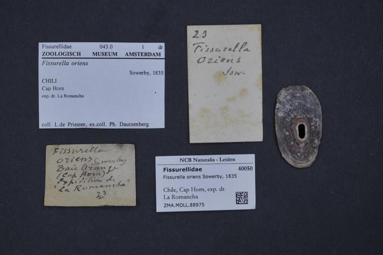 | Keywords: Naturalis Biodiversity Center - ZMA.MOLL.88975 - Fissurella oriens Sowerby, 1835 - Fissurellidae - Mollusc shell.jpeg artwork Dimensions artwork Document type Fissurellidae Fissurella Individual count Infraspecific epithet Infraspecific rank Institution Naturalis Kind of unit artwork Kind of unit specimen shell Life stage Chile Cap Horn exp dr La Romancha Medium artwork Nomenclatural code Source institute Zoölogisch Museum Amsterdam Scale the width of the text on the species/QR-code label is 38 mm Occurrence ID page Other fields Other versions artwork Permission license Naturalis donation CC-0 Publication location Scientific name Fissurella oriens Sowerby 1835 Scientific name authorship Sowerby 1835 Source url http //bioportal naturalis nl Specific epithet oriens State or province Cap Horn Subject keywords artwork Subject keywords publication Title artwork Title publication Type status Uploaded with GWToolset Naturalis_Biodiversity_Center_-_ZMA MOLL 88975_-_Fissurella_oriens_Sowerby _1835_-_Fissurellidae_-_Mollusc_shell http //medialib naturalis nl/file/id/ZMA MOLL 88975/format/large Molluscs at Naturalis from the Zoölogisch Museum Amsterdam Media donated by Naturalis Biodiversity Center Fissurella oriens Fissurella |
