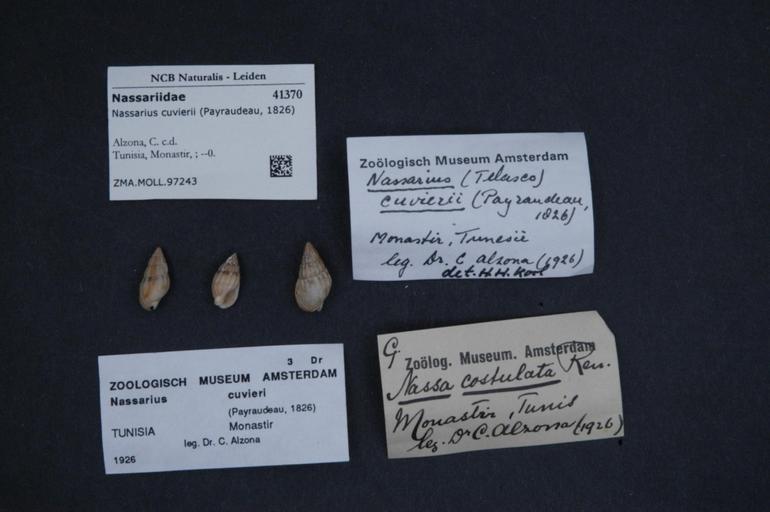 Keywords: Naturalis Biodiversity Center - ZMA.MOLL.97243 - Nassarius cuvierii (Payraudeau, 1826) - Nassariidae - Mollusc shell.jpeg artwork Dimensions artwork Document type Nassariidae subfamily Nassariinae Nassarius Individual count Infraspecific epithet Infraspecific rank Institution Naturalis Kind of unit artwork Kind of unit specimen shell Life stage Tunisia Monastir Medium artwork Nomenclatural code Collection remarks Moll Source institute Zoölogisch Museum Amsterdam Scale the width of the text on the species/QR-code label is 38 mm Occurrence ID page Other fields Other versions artwork Permission license Naturalis donation CC-0 Mollusca Publication location Scientific name Nassarius cuvierii Payraudeau 1826 Scientific name authorship Payraudeau 1826 Source url http //bioportal naturalis nl Specific epithet cuvierii State or province Monastir Subject keywords artwork Subject keywords publication Title artwork Title publication Type status Uploaded with GWToolset Naturalis_Biodiversity_Center_-_ZMA MOLL 97243_-_Nassarius_cuvierii_ Payraudeau _1826 _-_Nassariidae_-_Mollusc_shell http //medialib naturalis nl/file/id/ZMA MOLL 97243/format/large Molluscs at Naturalis from the Zoölogisch Museum Amsterdam Media donated by Naturalis Biodiversity Center Nassarius cuvierii Nassarius