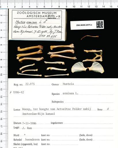 Keywords: Naturalis Biodiversity Center - ZMA.MAM.22975.a lab 1 - Mustela erminea Linnaeus - skeleton (part).jpeg artwork Dimensions artwork Document type Mustela Individual count 1 Infraspecific epithet Infraspecific rank Institution Naturalis Kind of unit artwork Kind of unit specimen skeleton part Life stage Netherlands Noord Holland Weesp Aatveltse polder Medium artwork Nomenclatural code Occurrence ID page Other fields Other versions artwork Permission license Naturalis donation CC-0 Publication location Scientific name Mustela erminea Linnaeus Scientific name authorship Linnaeus male Source url http //bioportal naturalis nl Specific epithet erminea State or province Noord Holland Subject keywords artwork Subject keywords publication Title artwork Title publication Type status Uploaded with GWToolset Naturalis_Biodiversity_Center_-_ZMA MAM 22975 a_lab_1_-_Mustela_erminea_Linnaeus_-_skeleton_ part http //medialib naturalis nl/file/id/ZMA MAM 22975 a_lab_1/format/large Mammals at Naturalis from the Zoölogisch Museum Amsterdam Media donated by Naturalis Biodiversity Center Mustela erminea Mustela |