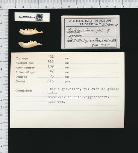 Keywords: Naturalis Biodiversity Center - ZMA.MAM.14044.a lab - Mustela putorius Linnaeus - skull.jpeg artwork Dimensions artwork Document type Mustela Individual count 1 Infraspecific epithet Infraspecific rank Institution Naturalis Kind of unit artwork Kind of unit specimen skull Life stage Netherlands Noord Holland Zandvoort Medium artwork Nomenclatural code Occurrence ID page Other fields Other versions artwork Permission license Naturalis donation CC-0 Publication location Scientific name Mustela putorius Linnaeus Scientific name authorship Linnaeus female Source url http //bioportal naturalis nl Specific epithet putorius State or province Noord Holland Subject keywords artwork Subject keywords publication Title artwork Title publication Type status Uploaded with GWToolset Naturalis_Biodiversity_Center_-_ZMA MAM 14044 a_lab_-_Mustela_putorius_Linnaeus_-_skull http //medialib naturalis nl/file/id/ZMA MAM 14044 a_lab/format/large Mammals at Naturalis from the Zoölogisch Museum Amsterdam Media donated by Naturalis Biodiversity Center Mustela putorius Mustela