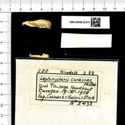 | Keywords: Naturalis Biodiversity Center - ZMA.MAM.52275 lat - Leptonycteris curasoae - skull.jpeg artwork Dimensions artwork Document type Leptonycteris Individual count 1 Infraspecific epithet Infraspecific rank Institution Naturalis Kind of unit artwork Kind of unit specimen skull Life stage Grot Plantage Noordkant CuraƧao Medium artwork Nomenclatural code Occurrence ID page Other fields Other versions artwork Permission license Naturalis donation CC-0 Publication location Scientific name Leptonycteris curasoae Scientific name authorship female Source url http //bioportal naturalis nl Specific epithet curasoae State or province Subject keywords artwork Subject keywords publication Title artwork Title publication Type status Uploaded with GWToolset Naturalis_Biodiversity_Center_-_ZMA MAM 52275_lat_-_Leptonycteris_curasoae_-_skull http //medialib naturalis nl/file/id/ZMA MAM 52275_lat/format/large Mammals at Naturalis from the Zoƶlogisch Museum Amsterdam Media donated by Naturalis Biodiversity Center Leptonycteris curasoae Leptonycteris |
