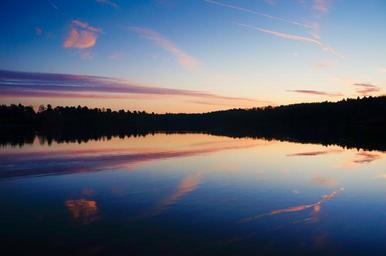 Keywords: nature lake water reflection glassy calm mirror landscape outdoor forest sunset twilight dusk evening scene peaceful colors romantic