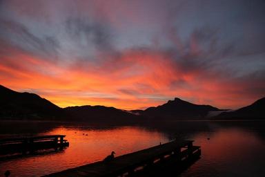Keywords: nature landscape sunset summer clouds natural sky water mountains lake red bright red mirroring afterglow sunrise austria mondsee wave evening atmosphere evening sky abendstimmung twilight