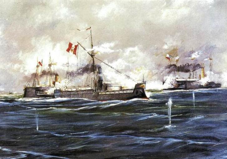 | Keywords: Naval Battle of Angamos 1879.jpg oil cm Museo Naval del Perú Callao Lima Colección Manuel Cisneros Sánchez Lima object history exhibition history credit line accession number place of creation Photographs of military flags of Peru Paintings of naval battles Naval ships of Peru Buques de la Guerra del Pacifico Battle of Angamos PD-Art |