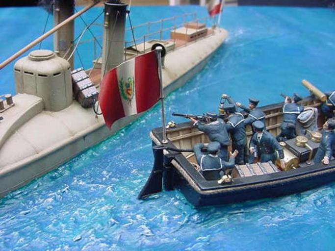 Keywords: Naval battle of Callao.jpg Foto de modelo a escala del combate naval del Callao del 25 de mayo de 1880 entre la torpedera chilena Janequeo y la lancha peruana Independencia Own date Ernesto Linares Naval battles of the War of the Pacific Navy of Peru Models of battles |