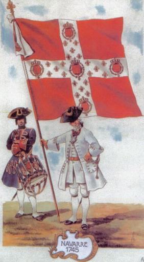 Keywords: Navarre 1745 (Coll.Perso.).jpg Officier porte drapeau de l'enseigne régimentaire du Régiment de Navarre en 1745 avec tambour régimentaire même époque Lithographie de Rigo Drapeau du Régiment de Navarre 2006-03-09 own assumed Achéron