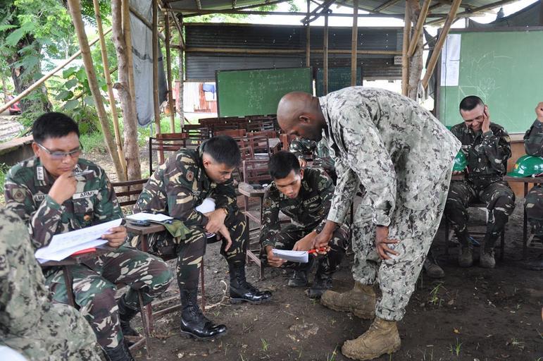 Keywords: Navy and Philippine engineers work together during Pacific Partnership 2015 150621-N-ZZ999-098.jpg en ROXAS CITY Philippines Construction Electrician 1st Class Arndra Dangerfield project supervisor from Dayton Ohio and Armed Forces of the Philippines engineers review designs for a future construction project during Pacific Partnership 2015 Seabees from Naval Mobile Construction Battalion Five are planning to build a two-room classroom as part of a project at the Roxas School for Philippine Craftsmen The hospital ship USNS Mercy is scheduled to visit the Philippines for its third mission stop of PP15 Pacific Partnership is in its tenth iteration and is the largest annual multilateral humanitarian assistance and disaster relief preparedness mission conducted in the Indo-Asia-Pacific region While training for crisis conditions Pacific Partnership missions to date have provided real world medical care to approximately 270 000 patients and veterinary services to more than 38 000 animals Critical infrastructure development has been supported in host nations during more than 180 engineering projects 2015-06-20 June 21 2015 https //www dvidshub net/image/2022585 150621-N-ZZ999-098 2015-06-23 07 45 ROXAS CITY PH PD-USGov-Military-Navy USNS Mercy T-AH-19 Pacific Partnership 2015 Images from DoD uploaded by Fæ |