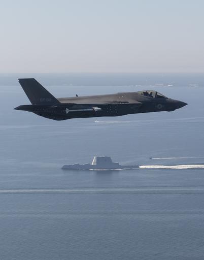 | Keywords: Navy's Next Gen F-35 Stealth Strike Fighter Flies Over Next Gen Stealth Guided-Missile Destroyer, USS Zumwalt (DDG 1000) 161017-N-VT045-002.jpg  en An F-35 Lightning II Carrier Variant piloted by U S Marine Corps Maj Robert Champ Guyette II a test pilot from the F-35 Pax River Integrated Test Force assigned to the Salty Dogs of Air Test and Evaluation Squadron 23 flies over the stealth guided-missile destroyer USS Zumwalt as the ship transits the Chesapeake Bay on Oct 17 2016 USS Zumwalt the Navy's newest and most technologically advanced surface ship joined the fleet Oct 15 The F-35C Lightning II ” a next generation single-seat single-engine strike fighter that incorporates stealth technologies defensive avionics internal and external weapons and a revolutionary sensor fusion capability ” is designed as the U S Navy ™s first-day-of-war survivable strike fighter The U S Navy anticipates declaring the F-35C combat-ready in 2018 Unit Navy Media Content Services DVIDS Tags San Diego; Baltimore; F-35; Navy; Marine Corps; VX-23; Chesapeake Bay; NAVAIR; NAS Patuxent River; DDG-1000; F-35C; DDG 1000; 5th gen; Pax River; NMCS; USS Zumwalt; DVIDS Bulk Import; ITF; Pax River ITF; Atlantic Test Ranges; fifth gen; CF-02; next gen 2016-10-17 CV https //www dvidshub net/image/2932876/navys-next-gen-f-35-stealth-strike-fighter-flies-over-next-gen-stealth-guided-missile-destroyer-uss-zumwalt-ddg-1000 161017-N-VT045-002 2016-10-20 00 48 PATUXENT RIVER MD US PD-USGov-Military-Navy F-35C Lightning II Images from DoD uploaded by Fæ |