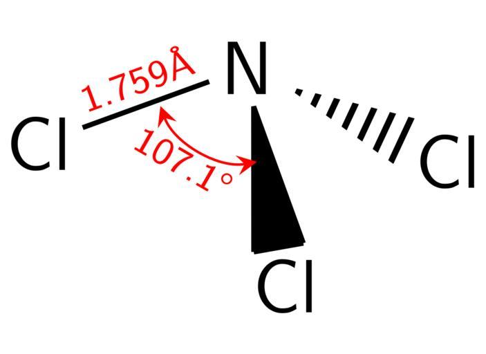 | Keywords: NCl3 dimensions.svg en Structural formula of the nitrogen trichloride molecule NCl3 with a nitrogen-chlorine bond of length 1 759 Ã… and a Cl-N-Cl angle of 107 1 ° Structural information determined by gas-phase electron diffraction from http //www hbcpnetbase com/ CRC Handbook 91st edition page 9 “25 2014-09-15 18 06 17 own Krishnavedala validSVG cc-zero Uploaded with UploadWizard Nitrogen trichloride | ||||