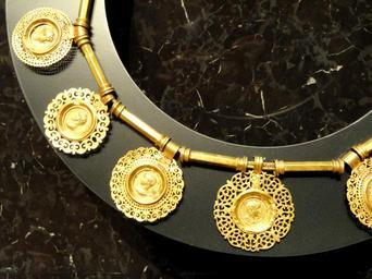 | Keywords: Necklace with Gold Coins, said to be from a tomb at Aboukir near Alexandria, Egypt, from the reign of Gordian III (238-243 CE) or slightly later - Nelson-Atkins Museum of Art - DSC08232.JPG Exhibit in the Nelson-Atkins Museum of Art Kansas City Missouri USA Photography was permitted in the museum without restriction; I took this photograph and release it into the public domain Daderot 2011-11-04 17 50 26 Daderot PD-old PD-old Ancient Roman art in the Nelson-Atkins Museum of Art Archaeological gold objects |