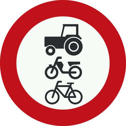 | Keywords: Nederlands verkeersbord C9.svg  Netherlands road sign C9 - No access for riders cattle wagons motor vehicles not able to exceed a speed of 25km/h microcars bicycles mopeds or invalid carriages Nederlands verkeersbord C9 - Gesloten voor ruiters vee wagens motorvoertuigen die niet sneller kunnen of mogen rijden dan 25 km/h en brommobielen alsmede fietsen bromfietsen en gehandicaptenvoertuigen http //www verkeerenwaterstaat nl/Images/RVV_2006_tcm195-160624 pdf Verkeersborden en Verkeersregels in Nederland 2007-08-04 SVG version by Bouwe Brouwer PD-NL-verkeersbord Category Motorcycle silhouettes Diagrams of road signs of the Netherlands road closed warnings C09 Bicycles forbidden road signs Prohibitory road signs Black red white road signs Tractors forbidden signs |