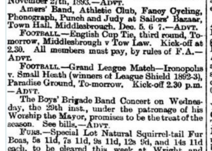 | Keywords: NEGazetteSmallAds24Nov1893.jpg association football match between Middlesbrough Ironopolis and Small Heath in the Football League Second Division to be played on 25 November 1893 Scan of an excerpt from advertisements and notices column English newspaper The North-Eastern Gazette 24 November 1893 page 3 Author 1893-11-24 pd-old Birmingham City F C Middlesbrough Ironopolis F C | ||||
