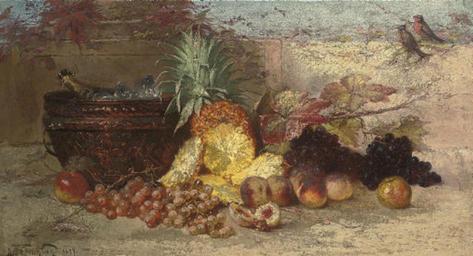 | Keywords: Nel Grönland - Trauben, Pfirsiche, Ananas und Champagner.jpg Nelius Grönland German 1859-1918 en Grapes peaches a pineapple and champagne 1899 oil canvas cm 64 1 115 object history credit line signed and dated 'Nel Grönland 1899' lower left Still-life accession number Christie's online 5047426 PD-old-auto-1923 1918 Nel Grönland 1890s still-life paintings | ||||