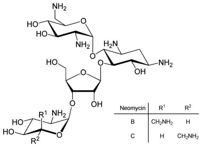 Keywords: Neomycin B C.svg Neomycin B and Neomycin C own 2008-05-18 Yikrazuul Aminoglycoside antibiotics
