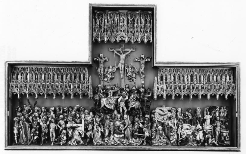 | Keywords: Netherlandish - Altarpiece with the Passion of Christ - Walters 6157.jpg  The seven scenes of this Passion altarpiece are carved from separate blocks of wood They are the Arrest of Christ the Flagellation Christ Carrying the Cross the Crucifixion crucified figures and angels are later replacements Christ's Body Lowered from the Cross the Entombment and the Resurrection Each vignette is individually composed and originally was probably divided from the next by slender columns at every third arch We suggest this division by inserting a painted backdrop to complement the remaining authentic architectural detailing To ensure that the drama of the Passion could be seen from a distance the artist made the figures animated with large heads and exaggerated gestures accentuated through color He also raised the rear figures The use of wood allows the carving of weapons and other intricate details as stone would not In the 1490s there were several workshops in Brussels producing large complex carved altarpieces often for distant markets The most famous shop was that of Jan Borman to which our altarpiece was once attributed The Walters' altarpiece was made for the Collegiate Church of Blainville-Crevon in Normandy in northwestern France The altarpiece was damaged at some point in the past perhaps during the 16th century conflicts between Protestants and Catholics The Crucified Christ the two thieves and the attendant angels are 16th- or 17th-century replacements between 1492 1495 Late Medieval-Renaissance painted and gilded wood oak cm 235 367 3 31 4 on pedestal cm 108 6 370 8 33 accession number 61 57 6997 Jacques Seligmann Paris by purchase Henry Walters city Baltimore Walters Art Museum Henry Walters Acquired by Henry Walters 1912 place of origin Brussels Belgium Walters Art Museum license Medieval art in the Walters Art Museum Renaissance sculpture in the Walters Art Museum Art of the Netherlands Media contributed by the Walters Art Museum needs category review |