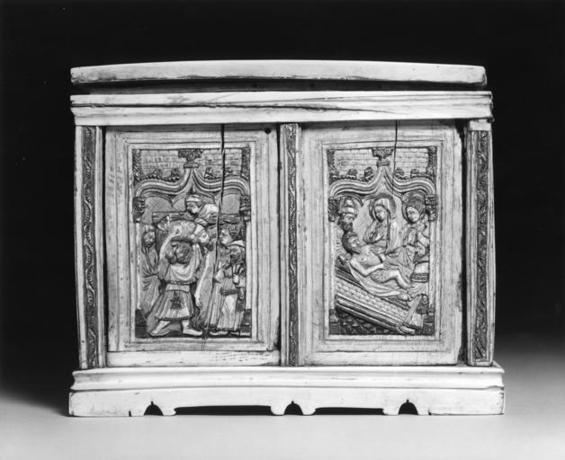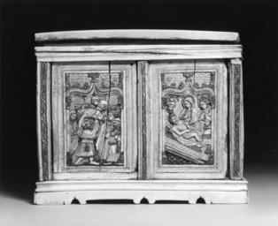 Keywords: Netherlandish - Casket with Scenes from the Passion of Christ - Walters 71251 - Right.jpg This type of large rectangular box elaborately decorated with scenes depicting either the Passion of Christ or the Life of the Virgin was produced in great quantity in 15th-century Flanders The artist drew inspiration from contemporary woodcuts particularly the Bible of the Poor Biblia Pauperum a pictorial Bible for the illiterate first produced ca 1430 This example depicts Christ's Passion The scenes of Christ's Arrest his Carrying of the Cross Entombment Harrowing of Hell Resurrection and Appearance to Mary Magdalene have all been taken from this source The carved panels retain much of their original paint and gilding The gilded bronze lock plate on top is a 17th-century addition ca 1450 Late Medieval ivory gilt bronze paint cm 16 1 31 5 19 4 accession number 71 251 39550 Count Girolamo Possenti Fabriano Sale Raphael Dura Florence April 1 1880 no 38 F Ongania Venice Henry Walters Baltimore by purchase Walters Art Museum Henry Walters Acquired by Henry Walters place of origin Flanders Walters Art Museum license Medieval art in the Walters Art Museum Renaissance applied arts in the Walters Art Museum Art of the Netherlands Media contributed by the Walters Art Museum needs category review Biblia pauperum |