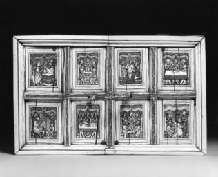 Keywords: Netherlandish - Casket with Scenes from the Passion of Christ - Walters 71251 - Top.jpg This type of large rectangular box elaborately decorated with scenes depicting either the Passion of Christ or the Life of the Virgin was produced in great quantity in 15th-century Flanders The artist drew inspiration from contemporary woodcuts particularly the Bible of the Poor Biblia Pauperum a pictorial Bible for the illiterate first produced ca 1430 This example depicts Christ's Passion The scenes of Christ's Arrest his Carrying of the Cross Entombment Harrowing of Hell Resurrection and Appearance to Mary Magdalene have all been taken from this source The carved panels retain much of their original paint and gilding The gilded bronze lock plate on top is a 17th-century addition ca 1450 Late Medieval ivory gilt bronze paint cm 16 1 31 5 19 4 accession number 71 251 39550 Count Girolamo Possenti Fabriano Sale Raphael Dura Florence April 1 1880 no 38 F Ongania Venice Henry Walters Baltimore by purchase Walters Art Museum Henry Walters Acquired by Henry Walters place of origin Flanders Walters Art Museum license Medieval metalwork in the Walters Art Museum Renaissance applied arts in the Walters Art Museum Art of the Netherlands Media contributed by the Walters Art Museum needs category review Biblia pauperum |