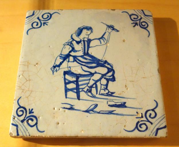 | View Original: | Netherlands tile depicting shoemaker stitching footware, 1 of 2, c. 1630, ceramic - Bata Shoe Museum - DSC00291.JPG (3188x2615) | |||