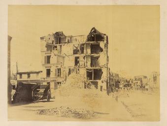 Keywords: Neuilly. Rue du Roule. Partial View of Destruction in the Streets WDL1317.png Artwork ru Б аквейе Б уно 1823 1875 гг fr Braquehais Bruno 1823-1875 en Braquehais Bruno 1823-1875 zh 布鲁诺·布拉奇海 ,1823-1875 年 pt Braquehais Bruno 1823-1875 ar براكهيه برونو، 1823-1875 es Braquehais Bruno 1823-1875 ru ейи Улица дю Руль Частичный вид аз ушений на улицах fr Neuilly Rue du Roule Vue partielle des ruines dans les rues en Neuilly Rue du Roule Partial View of Destruction in the Streets zh 讷伊 柔乐街头 被破 的街道的 部景观 pt Neuilly Rue du Roule Vista parcial da destruição nas ruas ar نويي شارع رول منظر جزئي للحطام الموجود في الشوارع ru П ичиной ф анко-п усской войны стал ост нап яженности в отношениях между Ф анцией и П уссией в 1860-х гг Ф анция п и импе ато е аполеоне III была полна ешимости п ове ить астущую силу П уссии и отомстить за то что она ассмат ивала как яд дипломатических унижений П уссия п и канцле е Отто фон Бисма ке считала что война ге манских госуда ств п отив Ф анции под уководством П уссии станет ешающим шагом к созданию единой Ге манской импе ии Конфликт начался 19 июля 1870 г когда Ф анция объявила войну Ф анцузская а мия оказалась ужасно неподготовленной и поте пела сок ушительное по ажение в битве п и Седане отк ыв до огу на Па иж К 19 сентяб я немцкие войска полностью ок ужили го од и начали осаду кото ая п одлилась более четы ех месяцев От езанные от поставок п одовольствия из сельской местности па ижане пытались выжить питаясь собаками кошками и даже животными из па ижского зоопа ка Де евья на Елисейских полях и в па ках были вы ублены и использованы в качестве топлива 5 янва я немецкие войска начали бомба ди овку го ода кото ая п одолжалась по несколько часов каждую ночь в течение 23 суток а ок естности Па ижа было сб ошено около 12 000 сна ядов кото ые убили около 400 человек Па иж сдался 28 янва я в сущности положив конец войне За по ажением ф анцузов последовало на одное восстание и установление в а те 1871г Па ижской коммуны еволюционного п авительства сфо ми ованного в соответствии с ана хистскими и социалистическими п инципами Коммуна была жестоко подавлена в мае 1871 г ф анцузскими войсками п авительства Адольфа Тье а Во в емя неп одолжительного конт оля над Па ижем коммуна ы аз ушали импе ато скую колонну на Вандомской площади Подавление коммуны п ивело к дальнейшим значительным аз ушениям в го оде когда коммуна ы подожгли дво ец Тюиль и Лув и д угие здания К оме того многие здания пост адали или были аз ушены во в емя отчаянной пе ест елки между коммуна ами и конт еволюционными силами Siege de Paris 1870 1871 Осада Па ижа 1870 1871 гг п едставляет собой альбом из 110 фотог афий сделанных Огюстом Б уно Б аквейе 1823 1875 гг ф анцузским фотог афом и п ог ессивным фотожу налистом документи овавшим осаду и последствия бомба ди овок а также аз ушения п оизошедшие во в емя Па ижской коммуны <br>Авеню де ейи Па иж Ф анция ; Ф анко-п усская война 1870 1871 гг ; Память ми а; Рю де Руль Па иж Ф анция ; Телеги и повозки; Уще б нанесенный войной fr La guerre franco-allemande fut provoquée par l escalade des tensions entre la France et la Prusse dans les années 1860 La France sous l empereur Napoléon III était déterminée à contenir la croissance de la puissance prussienne et à venger ce qui était considéré comme une série d humiliations diplomatiques La Prusse sous le chancelier Otto von Bismarck considérait qu une guerre dirigée par la Prusse et menée par les États allemands contre la France serait un acte décisif menant à la création d un empire allemand unifié Le conflit débuta le 19 juillet 1870 jour où la France déclara la guerre L armée française s avéra terriblement mal préparée et subit une défaite désastreuse lors de la bataille de Sedan laissant la voie libre vers Paris Le 19 septembre les Allemands encerclèrent complètement la ville et commencèrent un siège qui allait durer plus de quatre mois Coupés du ravitaillement provenant de la campagne les Parisiens survécurent en mange