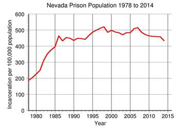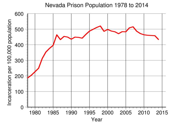 | Keywords: Nevada Prison Population.svg en Nevada prison incarceration rate per 100 000 population from 1978 to 2014 Data from http //www bjs gov/index cfm ty nps BJS 2016-05-11 own Delphi234 other versions current annually Generated with Wikimedia SVG Chart SVG Chart/box cc-zero Prisons in Nevada Imprisonment and detention rates in the United States |
