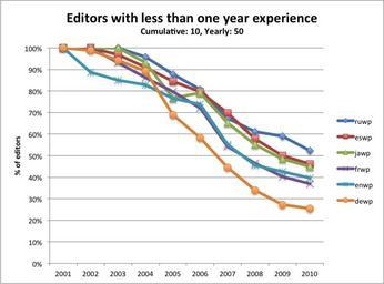 Keywords: New-editors-across-projects--10-50-.png en Percent of editors with less than one year experience Ru es ja fr en dp 2001-2010 WMF Howief Cc-zero Editor trends study