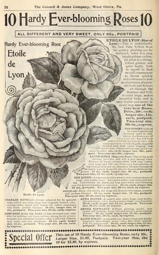 | Keywords: New floral guide (16240790814).jpg 14 <br> The Conard Jones Company West Grove Pa <br> 10 H ' y Ever-blooming looses Q <br> ALL DIFFERENT AND VERY SWEET ONLY 85c POSTPAID <br> lardy Ever-blooming Rose <br> Etoilc <br> Etoile de JLyon <br> CHARLES ROVOLLI Always admired for its splendid <br> buds which are extra large and elegantly formed coloi <br> creamy-white tinted with lemon the centre sometimes <br> rosy blush; profuse bloomer 10 cts ; larger size 15 <br> cts postpaid Two-year size 30 cts each express <br> COMTESSE RIZA DU PARC A fine all-round rose valu- <br> able for bedding and house culture; strong hardy grower <br> constant and abundant bloomer color a soft rosy crimson <br> very sweet and very handsome 10 cts each; larger <br> size 15 cts postpaid Two-year size 30 cts each <br> hy express <br> toii e b i yon star of <br> I/yon This is undoubtedly <br> the best Pure Yellow Rose <br> for f arden planting yet in- <br> troduced; color is a clear <br> bright golden-yellow <br> the plant is a strong <br> robust grower and <br> quite hardy both <br> in regard to heat <br> or cold; commences <br> to bloom quickly <br> and continues to bear <br> an abundance of splen- <br> did buds and flowers <br> all through the <br> Summer and Fall; <br> is extra large makes <br> beautiful buds and is <br> very dotible and sweet; in <br> every way one of tlie <br> very best Roses <br> Price iOc eacli; <br> 1 arger size 15c <br> each postpaid <br> Two-year size <br> 30 cts express <br> THE SUNSET is one of <br> he most fragrant and <br> Dijrfutiful roses in culti- <br> vation; the flowers are of <br> extra large size fine full form <br> and deliohtfully perfumed; color rich <br> coppery yellow or real old gold elegantly <br> clouded wuh dark ruddy crimson true <br> -' suu °t tints robust and vigorous and a con- <br> stint bloomti loo each; larger size 20c post- <br> paid Two-jear size 30c express <br> DEVONIENSIS Magnolia Rose -One of the good <br> old time favorites and still a peer among roses <br> Flovers of lo\ely creimv-white with rosy centre <br> \eiy large and full one of the very best varieties of <br> vigorous growth and an abundant bloomer throughout <br> he entire season desirable also for its ever-delicious fra- <br> grance 1 cts each; laiger size 30 cts postpaid <br> Two-jear size 35 cts each hy express <br> THE QUEEN A vigorous health\ grower and constant bearer of <br> large xer double ro'-e' Pure Siiow-white very sweet and last- <br> ing Lndoubtcdl the finest and be t pure-white ever-blooming <br> rose for general planting m ' ulnation 15 cts each; larger size <br> 20 cts postpaid T \o-year bize 30 cts each hy express <br> DOUGLAS Deep rich cherrj red large full flowers; very sweet constant <br> and profuse bloomer 10 cts each larger size 15 cts postpaid <br> Tv o-year size 30 cts each by express <br> ANNA OLIVER A superb rose extra large very double <br> full and sweet; color lovely creamy blush; verj- beautiful <br> 10 cts each; larger size 13 cts postpaid Two-year <br> size 30 cts each hy express <br> ANDRE SCHWARTZ - Brilliant glowing scarlet very <br> bright and striking; large full and sweet; a most constant <br> bloomer 10 cts each; larger size 15 cts postpaid <br> Two-year size 30 cts each by express <br> ALINE SISLEY A splendid rose; flowers large and double <br> fragrance exceedingly sweet; color fine violet crimson <br> Fine for open ground 10 cts each; larger size 15 cts <br> postpaid Two-year size 30 cts each by express <br> Ś Special Offer <br> Ś Ś Ś Ś Ś Ś Ś Ś Ś Ś Ś Ś Ś Ś Ś Ś Ś Ś Ś Ś Ś Ś Ś Ś Ś Ś Ś Ś Ś Ś Ś Ś Ś Ś Ś Ś Ś Ś Śf <br> This set of 10 Hardy Ever-blooming Roses only 85c <br> Larger Size 1 00 Postpaid Two year Size the <br> 10 for 2 50 by express f <br> Ś Ś Ś Ś Ś Ś Ś Ś Ś Ś Ś Ś Ś Ś Ś Ś Ś Ś Ś Ś Ś Ś Ś Ś Ś Ś Ś Ś Ś Ś Ś Ś Ś Ś Ś Ś Ś 42484176 134532 67120 Page 14 Text http //www biodiversitylibrary org/page/42484176 1901 10 1111/j 1469-7998 1865 tb02381 x Conard Jones Co West Grove Pa ; Henry G Gilbert Nursery and Seed Trade Catalog Collection NameFound Magnolia NameConfirmed Magnolia sect Splendentes Dandy ex J A Vazquez G EOLID 44478 Biodiversity Heritage Library New floral guide 1901 Garden Stories Bulbs Plants Catalogs Nursery stock Plants Ornamental Roses Seeds U S Department of Agriculture National Agricultural Library bhl page 42484176 dc identifier http //biodiversitylibrary org/page/42484176 Conard Jones Co Flowers West Grove PA Conard Jones Co bhlGardenStories BHLinbloom bulbs plants plants ornamental u s department of agriculture national agricultural library west grove pa conard jones co bhlgardenstories bhlinbloom Information field Flickr posted date ISOdate 2015-03-19 CC-BY-2 0 BioDivLibrary https //flickr com/photos/61021753 N02/16240790814 2015-08-23 23 55 04 cc-by-2 0 PD-old-70-1923 New floral guide 1901 Photos uploaded from Flickr by FĂŚ using a script |