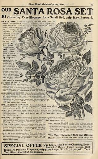 | Keywords: New floral guide (16675569958).jpg New Floral Guide Spring 1901 <br> ° SANTA ROSA SET <br> 10 Charming Ever-Bloomers for a Small Bed only 1 00 Postpaid <br> SANTA ROSA This is a grand New Tea Rose from Cali <br> fornia It somewhat resembles Hermosa but is larger and <br> more beautiful The flowers are large round full and <br> sweet; the color is rich rosv <br> pink shading to cop <br> pery-red A constant <br> and very abundant <br> bloomer and is <br> quite hardy; an <br> excellent rose <br> for the open <br> ground 15 <br> cts each <br> larg er size <br> 2 c ; post- <br> paid Two- <br> year size <br> 35 cts each <br> by express <br> VICOMTESSE DE <br> WAUTIER A <br> curious rose; it <br> deserves to be bi t- <br> ter known than it <br> is Its attractiveness <br> lies especially in the <br> unusual combination <br> of colors; rose yel- <br> low white and red ' <br> 15 cts each; larger <br> size 20 cts post- <br> paid Two-year <br> size 35 cts by expre <br> PRINCESS DE SAGAN <br> A fine new French rose valuable <br> for its buds and exquisite color Producing <br> beautiful buds of the brightest scailet crnn- <br> son; medium size semi-donble 10 cts each; larger <br> size 15c postpaid Two-year size 30c by express <br> MLLE HELENA GAMBIER A grand new Ever-bloom- <br> ing Rose; color lovely canary yellow with deep peachy- <br> red centre changing to creamy-pink as the flowers open <br> It makes a neat handsome bush blooms very quickl5' and <br> abundantly all through the season and the flowers are large <br> very double and sweet 15 cts each; larger size 20 cts Two- <br> year size 35 cts by exi ress <br> MADAME JOSEPH SCHWARTZ Pure white tinted with rose; large <br> handsome flowers; very fragant and beautiful 10 cts each; larger <br> size 16 cts jiostpaid Two-year size 30 cts by express <br> MLLE MARIE LOUISE OGER -Extra large very beautiful milky-white roses <br> elegantly shaded and tinged with golden-yellow; a good vigorous grower and mo' t <br> abundant bloomer 15 cts each; larger size 20 cts postpaid Two-jear <br> size 35 cts by express <br> MARGUERITE KETTEN- Tea-scented A very fine large beautifully formed rose ' <br> makes elegant buds deliciously sweet; fine peachy-yellow flushed with rose and <br> pink shades; a most constant and profuse bloomer 15 cts each; larger size <br> 20 cts postpaid Two-year size 35 cts by express <br> JULES FINGER Fine rich rosy-red extra large buds and <br> flowers; constant bloomer; very sweet; a good bushy <br> grower producing lots of beautiful buds and flowers all <br> the season 10 cts each; larger size 15 cts postpaid <br> Two-year size 30 cts by express <br> Santa Kosa <br> SOUV DE AUG METRAL Pure deep red large full <br> flowers of good form and substance delightfully fragrant <br> a strong vigorous grower and abundant bloomer 15 cts <br> each; larger size 20 cts postpaid Two-year size <br> 35 cts by express <br> MAD HENRY GRAIRE Another one of those sorts so <br> much admired as soon as known; bears large full flowers <br> of delicious fragrance and exquisite form The color is <br> fine bright rose shaded vermillion with bronze tints <br> 15 cts each; larger size 20 ct s postpaid TAVo-year <br> size 35 cts by express <br> The Most Charming 1 00 Set Offered <br> Most Beautiful Colors and Very Finest Fragra nce <br> SPECIAL OFFER <br> Our Santa Rosa Sety 10 Charming Ever- <br> Blooming Roses Finest colors Best <br> Bloomers Delicious Fragrance only 1 00; Larger Size L35 postpaid Two- <br> Year Size 10 for 2 50 by express 42484185 134532 67120 Page 23 Text http //www biodiversitylibrary org/page/42484185 1901 10 1111/j 1469-7998 1865 tb02381 x Conard Jones Co West Grove Pa ; Henry G Gilbert Nursery and Seed Trade Catalog Collection Biodiversity Heritage Library New floral guide 1901 Garden Stories Bulbs Plants Catalogs Nursery stock Plants Ornamental Roses Seeds U S Department of Agriculture National Agricultural Library bhl page 42484185 dc identifier http //biodiversitylibrary org/page/42484185 Conard Jones Co Flowers West Grove PA Conard Jones Co bhlGardenStories BHLinbloom bulbs plants plants ornamental u s department of agriculture national agricultural library west grove pa conard jones co bhlgardenstories bhlinbloom Information field Flickr posted date ISOdate 2015-03-19 Check categories 2015 August 23 CC-BY-2 0 BioDivLibrary https //flickr com/photos/61021753 N02/16675569958 2015-08-23 23 56 02 cc-by-2 0 PD-old-70-1923 New floral guide 1901 Photos uploaded from Flickr by FÌ using a script |