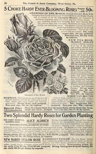 | Keywords: New floral guide (16675580878).jpg 28 <br> The Conard Jones Company West Grove Pa <br> 5 Choice Hardy Ever-Blooming Roses – lo ;; 50c <br> CHA31PIOX OF THE WO KLD-This splendid new Hardy Ever- <br> bloommg Rose is said to be a cross between Hermosa and Magna Charta <br> and is claimed to be the Champion Bloomer and champion in <br> hardmess fragrance vigor and color and also Winter bloom A <br> ver - beautiful hardy Ever-blooming Rose that everyone likes <br> The color is deep rich rosy-pmk; the flowers are large full and <br> double and deliciously sweet The plant is vigorous and thrifty <br> producing flowers abundantly all through <br> the growing season Fine for the open <br> ground and pot culture 15c each; <br> larger si e 20 cts postpaid <br> Two-year size 35 cts each <br> by express <br> NEW TEA ROSE <br> MAKIOX DINGEE <br> ” Deep brilliant crimson; <br> it is one of the darkest <br> and richest colored Ever- <br> blooming Roses we have <br> Very beautiful cup-shaped <br> flowers quite full and fra- <br> grant and borne in great <br> profusion all through the <br> growing season; excellent <br> for garden planting 15 <br> cts each; larger size <br> 20 cts each postpaid <br> THE GKANI DUKE <br> PIEKKE OF KUS- <br> S FA ” This is a very beauti- <br> ful new European Rose; <br> makes elegant long pointea <br> buds and finely formed <br> flowers of the very largest <br> size delightfully fragrant; <br> color bright rich rose with <br> apricot and fawn shading <br> A strong hardy grower and <br> a constant and abundant <br> bloomer 15 cts each; <br> larg-er size 20 cts <br> postpai Two-year <br> size 35c by express <br> MARIE VAN HOUTTE <br> ” A lovely Rose excelled by none; rich creamy- <br> white shaded with rose and pale canary-yellow; <br> large full flowers delightfully scented; constant <br> abundant bloomer 10c ; larger size 15c <br> postpaid Two-year size 30c express <br> These Five Grand Hardy Ever-blooming Roses strong plants only 50 cts <br> Larger size 60 cts postpaid Two-year size only 1 25 by express <br> Cliauipiou ot tlie World <br> HERMOSA ” Well-known as one of the best for <br> general planting; blooms in clusters all season; <br> clear bright pink very double and fragrant- <br> quite hardy lO and 15 cts each postpaid' <br> Two-year size 30 cts by express <br> Special ©fter <br> Two Splendid Hardy Roses for Garden Planting <br> NEW HARDY PERPETUAL- A ITF Ai HQirH Having thoroughly tested this grand new Garden <br> BLOOMING ROSE ' L MLL;g\SVyai gg grounds we take pleasure in <br> – H nrkCA minrscA j /-Ar» ti r- r - c-AKirr i recommcuding it as a remarkablv fine bush rose <br> Hybrid ROSA RUGOSA and CAROLINE DE SANSEL f planting; a true perpetual bloomer <br> producing lovely buds and flowers through the whole growing season The flowers are clear bright pink <br> very large perfectly double and exceedingly sweet and beautiful; the bush is a strong upright grower <br> with handsome foliage and entirely hardy needs no protection and is a most constant and abundant <br> bloomer; undoubtedlv one of the most valuable and satisfactorv Hardv Ever-blooming Roses ever offered <br> Strong plants 20' cts each; 3 for 50 cts ; 6 for 1 00 postpaid Two year size 35 cts <br> each; 3 for 1 00; 3 oO per dozen by express <br> NIFW HADHY YFI I HW DnQF HARRISOX'S YELLOW-The best Hardv Yellow <br> ilLff ilt\I\Ui ILLLV VY t\\o/ 3L j gg bright clear golden-yellow entirely hardy and fine for <br> planting with other hardy ornamental flowering shrubs; <br> makef a grand display of bright golden-yellow flowers early in Spring Good mailing' plants 20 <br> cts each; 3 for 50 cts ; 6 for 1 00; postpaid Strong field-grown dormant bushes 30 <br> cts each; 2 50 per dozen by express 42484190 134532 67120 Page 28 Text http //www biodiversitylibrary org/page/42484190 1901 10 1111/j 1469-7998 1865 tb02381 x Conard Jones Co West Grove Pa ; Henry G Gilbert Nursery and Seed Trade Catalog Collection NameFound Charta NameConfirmed Charta NameBankID 4106878 NameFound Rosa rugosa NameConfirmed Rosa rugosa EOLID 631307 NameBankID 2649990 Biodiversity Heritage Library New floral guide 1901 Garden Stories Bulbs Plants Catalogs Nursery stock Plants Ornamental Roses Seeds U S Department of Agriculture National Agricultural Library bhl page 42484190 dc identifier http //biodiversitylibrary org/page/42484190 Conard Jones Co Flowers West Grove PA Conard Jones Co bhlGardenStories BHLinbloom bulbs plants plants ornamental u s department of agriculture national agricultural library west grove pa conard jones co bhlgardenstories bhlinbloom Information field Flickr posted date ISOdate 2015-03-19 Check categories 2015 August 23 CC-BY-2 0 BioDivLibrary https //flickr com/photos/61021753 N02/16675580878 2015-08-23 23 51 11 cc-by-2 0 PD-old-70-1923 New floral guide 1901 Photos uploaded from Flickr by Fæ using a script |