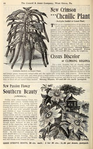 | Keywords: New floral guide (16863203425).jpg 44 <br> The Conard Jones Company West Grove Pa <br> New Crimson <br> -Clienille Plant <br> Acalypha Sandcri or Comet Plant <br> THIS cut is a representation of the plant as it <br> really appears and is not at all overdrawn <br> It grows 10 to 12 inches high blooms <br> quickly and abundantly and the flower tassels <br> grow as long as the plant is high They are <br> covered all over with fine crimson flowers look- <br> ing almost exactly as if made of crimson chenille <br> or silken plush The plant likes heat and moist- <br> ure and good rich soil but grows easily and <br> blooms so quickly that many are beginning to <br> flower when sent out When warm weather <br> comes set out in the flower bed and it will <br> grow the whole season A most surprising Fall <br> novelty and a great curiosity Sti'Oiig' Plants <br> 15 20 and 25 cts postpaid Extra <br> size 35 and 40 cts eacb by express <br> Cissus Discolor <br> or CLIMBING BEGONIA <br> Not a true Begonia but an elegant vining <br> window plant having as richly colored foliage <br> as the finest Painted Leaf Begonias Has long <br> heart-shaped leaves with a rich metallic lustre <br> Acalyplia Sanderi or Comet Plant Exquisitely marked in different shades of silver <br> and bronze green beautifully veined with red the under side being dark rich crimson Extra fine for <br> window boxes vases and pots and when given a small trellis a foot or two high for support soon makes <br> a parlor plant of almost unequalled beauty It likesheat and moisture and may be kept growing all the <br> time or dried off and rested when desired Strong' Plants 15 and 20 ctS each postpaid <br> New Passion Flower <br> Southern Beauty <br> AMERICA <br> Unlike most other Passion Vines this <br> splendid new variety besides being ex- <br> quisitely beautiful is a strong \-igorous <br> grower and entirely hard -; will climb up <br> a trellis 10 to 20 feet high in a season and <br> cover it all over with splendid wreaths <br> and clusters of large handsome flowers <br> and foliage The flowers are four to five <br> inches across and the color is an elegant <br> combination of red white and blue shades so <br> entirely unique and striking that they attract <br> attention at once The form of the flowers <br> though much reduced in size is well <br> shown in the engraving and as the foli- <br> age is handsome also it can be recom- <br> mended as one of the choicest and most <br> beautiful hardy flowering vines now of- <br> fered In very exposed situations the <br> roots should have a covering of leaves or <br> litter before severe freezing; they can <br> then remain in the ground over Winter <br> and will bloom every season for years <br> GOOD STRONG ROOTS 20 cts each; 3 for 50 cts ; 1 50 per dozen postpaid 42484206 134532 67120 Page 44 Text http //www biodiversitylibrary org/page/42484206 1901 10 1111/j 1469-7998 1865 tb02381 x Conard Jones Co West Grove Pa ; Henry G Gilbert Nursery and Seed Trade Catalog Collection NameFound Acalypha NameConfirmed Acalypha L EOLID 7026660 NameFound Begonia NameConfirmed Begonia aff palmata GBG 002-089-95 EOLID 11904651 NameFound Cissus NameConfirmed Cissus L EOLID 11204251 NameBankID 456134 Biodiversity Heritage Library New floral guide 1901 Garden Stories Bulbs Plants Catalogs Nursery stock Plants Ornamental Roses Seeds U S Department of Agriculture National Agricultural Library bhl page 42484206 dc identifier http //biodiversitylibrary org/page/42484206 Conard Jones Co Flowers West Grove PA Conard Jones Co bhlGardenStories BHLinbloom bulbs plants plants ornamental u s department of agriculture national agricultural library west grove pa conard jones co bhlgardenstories bhlinbloom Information field Flickr posted date ISOdate 2015-03-19 Check categories 2015 August 23 CC-BY-2 0 BioDivLibrary https //flickr com/photos/61021753 N02/16863203425 2015-08-23 23 51 25 cc-by-2 0 PD-old-70-1923 New floral guide 1901 Photos uploaded from Flickr by Fæ using a script |