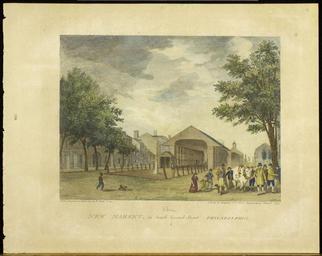 Keywords: library company of philadelphia librarycompanyofphiladelphia african americana africanamericana second street secondstreet headhouse headhouse market headhousemarket south philadelphia southphiladelphia engravings fiddle boys streets architecture cows marketplace philadelphia photo border outdoor Street scene with a view of the New Market shed on South Second Street. Depicts a group of men, women, and children gathered by a bull decorated with garlands of flowers near the shed, possibly a procession of a butcher's trade association. An African American fiddle player entertains the group as an African American boy runs toward them. Attached to the back of the shed is the fire engine house with cupola, known as the headhouse." The New Market, erected about 1745, was created following a petition by the growing population of South Philadelphia residents who found it a hardship to cross Dock Creek to reach the High Street. The shed was razed in 1956 and rebuilt in 1963. p-2276-35. Drawn, Engraved & Published by W. Birch & Son. 1799. Link to record on ImPAC, the Library Company’s digital collections catalog: lcpdams.librarycompany.org:8881/R/-?func=dbin-jump-full&a... Street scene with a view of the New Market shed on South Second Street. Depicts a group of men, women, and children gathered by a bull decorated with garlands of flowers near the shed, possibly a procession of a butcher's trade association. An African American fiddle player entertains the group as an African American boy runs toward them. Attached to the back of the shed is the fire engine house with cupola, known as the headhouse." The New Market, erected about 1745, was created following a petition by the growing population of South Philadelphia residents who found it a hardship to cross Dock Creek to reach the High Street. The shed was razed in 1956 and rebuilt in 1963. p-2276-35. Drawn, Engraved & Published by W. Birch & Son. 1799. Link to record on ImPAC, the Library Company’s digital collections catalog: lcpdams.librarycompany.org:8881/R/-?func=dbin-jump-full&a...