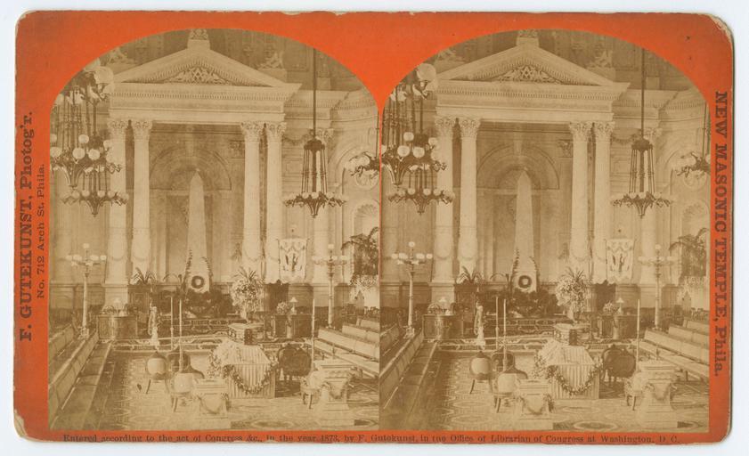 | Keywords: stereographs philadelphia new masonic temple newmasonictemple grand lodge room grandlodgeroom obelisks frederick gutekunst frederickgutekunst freemasonry View of the eastern end of the Grand Lodge Room in the New Masonic Temple in Philadelphia, 1873. Chandeliers, ornate molding, geometric floral flooring and flower garlands adorn the room. Rows of benches face the sunken center of the room, where chairs line either side of an altar. At the center of the east wall, an obelisk stands beneath a pediment supported by four columns. Accession number: P.2011.47.1469 View of the eastern end of the Grand Lodge Room in the New Masonic Temple in Philadelphia, 1873. Chandeliers, ornate molding, geometric floral flooring and flower garlands adorn the room. Rows of benches face the sunken center of the room, where chairs line either side of an altar. At the center of the east wall, an obelisk stands beneath a pediment supported by four columns. Accession number: P.2011.47.1469 |