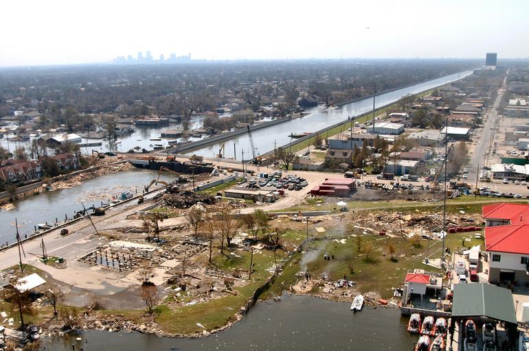 Keywords: New Orleans USACE-17th Canal-A-09-04-05 0004.JPG New Orleans after Hurricane Katrina The 17th Street Canal stretches southward the boundry between Jefferson and Orleans Parishes in Louisiana This aerial photo was taken Sunday September 4 2005 The bridge in the foreground The Old Hammond Highway Bridge undergoing a rebuilding before the storm enabled Army Corps of Engineers contracts to drive sheet piling to close off the canal from Lake Ponchartrain The Lake Pontchartrain end of the Canal is just over block distant off the lower left edge of the photo Looking down the canal the breach into Orleans Parish is visible The skyline of the New Orleans Central Business District lies in the distance In the front center left the pilings are all that remain of locally famous Sid-Mar's Seafood Restaurant destroyed by the storm U S Army Corps of Engineers photo by Alan Dooley http //www usace army mil/katrina-images/NO-A-09-04-05_0004 JPG Related images include <gallery> Image New Orleans USACE-Blackhawk-A-09-04-05 0072 jpg Blackhawk helicopter delivering sandbag Pattern of sandbags is similar to this image Image Sheet pile New Orleans-09-04-05 JPG Sheet pile material </gallery> PD-USGov 17th Street Canal after Katrina Hurricane Katrina aftermath in New Orleans Sheet piling |