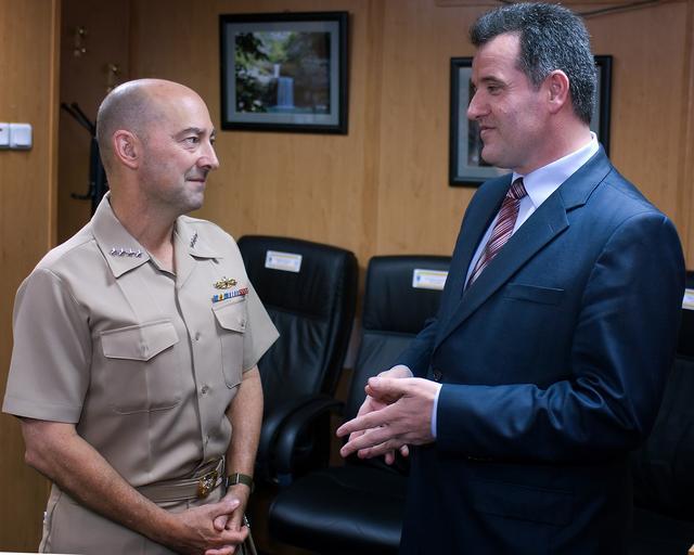 Keywords: New SACEUR makes first visit to Kosovo DVIDS461463.jpg en Adm James Stavridis supreme allied commander europe today travelled to Pristina Kosovo to meet with Kosovo Security Force Minister Fehmi Mujota commander of NATO's Kosovo Force; Lt Gen Giuseppe Emilio Gay; and KFOR Multinational Task Forces commanders Stavridis took the opportunity to discuss the current Kosovo security situation NATO's recent decision to reduce the profile of NATO forces in Kosovo the KSF training and recruiting progress training resources and equipment requirements as well as the current status of the EULEX deployment I am very satisfied with the latest developments in Kosovo The NAC decision to further reduce the profile of NATO forces in Kosovo is a clear indication of confidence in local capacity capability and responsibility The government of Kosovo is steadily taking on more and more of the responsibility for ensuring the rule of law and governance of the Kosovo population said Stavridis after meeting with Minister Mujota NATO will remain committed to promoting peace stability prosperity and respect for human rights in the region Our goal is to see the responsibility for maintaining peace shift to the local population and institutions further emphasized Stavridis Addressing MNTF commanders Stavridis said The progress NATO achieved in Kosovo is significant and KFOR's move toward Deterrent Presence is a sign of the Alliance's confidence in the progress made It allows NATO to adopt a new force structure concept reducing the number of troops deployed in Kosovo Stavridis continued During his Kosovo visit Stavridis also visited Gazimestan monument the site of the Battle of Kosovo which took place in 1389 and Sultan Murad's Tomb It was Admiral's Stavridis first visit in Kosovo since assuming his post as Supreme Commander Allied Powers Europe commander of NATO's Allied Command Operations earlier this month Stavridis presents a gift to Mr Mujota minister Kosovo Security Forces during his first visit 2009-07-29 left https //www dvidshub net/image/461463 090729-D-+++++-140 2011-09-23 12 50 PRISTINA ZZ PD-USGov James Stavridis Images from DoD uploaded by Fæ |