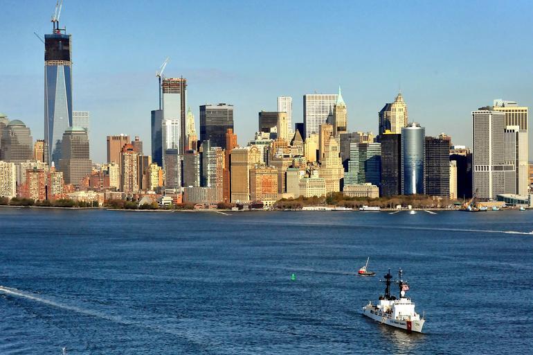 Keywords: new york city skyscrapers buildings architecture bay skyline urban boat coast guard harbor water outside