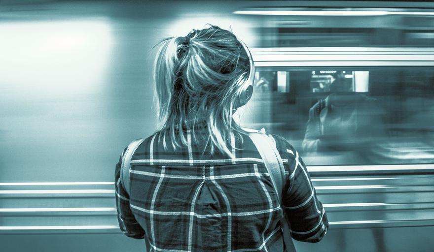 Keywords: new york subway 42nd street train station movement motion woman back view headphones waiting reflection