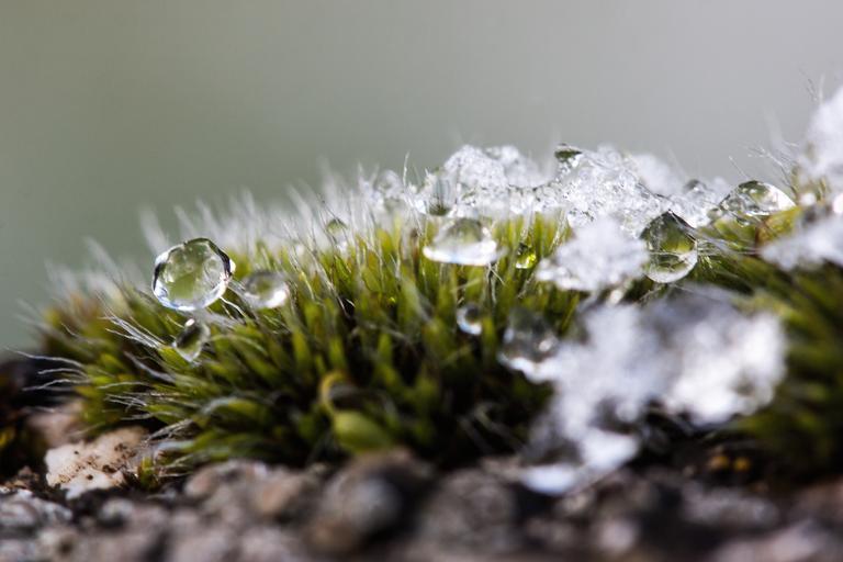 Keywords: new zealand moss winter snow cold transition autumn frozen melted drop of water drip