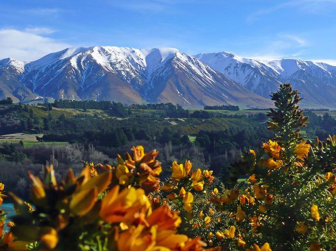 Keywords: new zealand mountains gorse yellow landscape nature outdoor scene snow summer