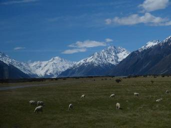 Keywords: new zealand nature landscape south island wilderness steep high mountains snow ice glacier mountain mount cook mt cook southern alpine meadow grass sheep flock flock of sheep animals wool pasture land