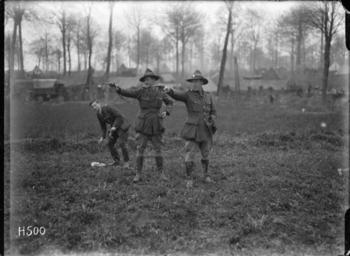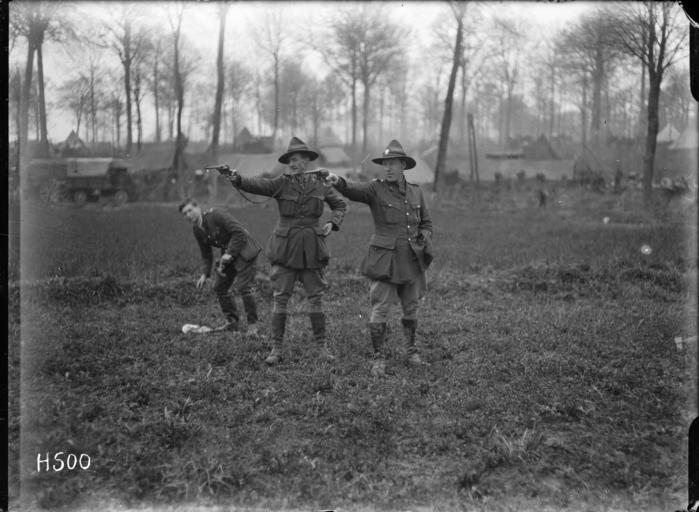 Keywords: blackandwhite monochrome outdoor black and white New Zealand officers practice shooting with pistols before going to the front, Acheux, France. Photographed 14 April 1918 by Henry Armytage Sanders. Inscriptions: Inscribed - Photographer's title on negative -bottom left: H500. Quantity: 1 b&w original negative(s). Physical Description: Dry plate glass negative 4.75 x 6.5 inches New Zealand officers practice shooting with pistols, Acheux, France. Royal New Zealand Returned and Services' Association :New Zealand official negatives, World War 1914-1918. Ref: 1/2-013119-G. Alexander Turnbull Library, Wellington, New Zealand. natlib.govt.nz/records/22700188 New Zealand officers practice shooting with pistols before going to the front, Acheux, France. Photographed 14 April 1918 by Henry Armytage Sanders. Inscriptions: Inscribed - Photographer's title on negative -bottom left: H500. Quantity: 1 b&w original negative(s). Physical Description: Dry plate glass negative 4.75 x 6.5 inches New Zealand officers practice shooting with pistols, Acheux, France. Royal New Zealand Returned and Services' Association :New Zealand official negatives, World War 1914-1918. Ref: 1/2-013119-G. Alexander Turnbull Library, Wellington, New Zealand. natlib.govt.nz/records/22700188 |