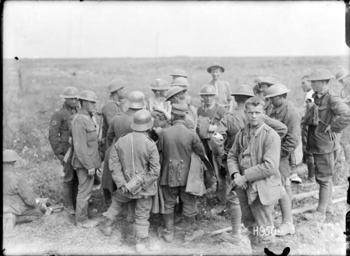 Keywords: blackandwhite monochrome people outdoor black and white New Zealand soldiers examine the papers of German prisoners of war during World War I. A bare-headed prisoner stands in the foreground. Photograph taken at Grevillers, France 24 August 1918 by Henry Armytage Sanders. Inscriptions: Inscribed - Photographer's title on negative -bottom right: H950. Quantity: 1 b&w original negative(s). Physical Description: Dry plate glass negative 4 x 5 inches New Zealand soldiers examining German prisoners' papers, World War I. Royal New Zealand Returned and Services' Association :New Zealand official negatives, World War 1914-1918. Ref: 1/2-013520-G. Alexander Turnbull Library, Wellington, New Zealand. natlib.govt.nz/records/22773750 New Zealand soldiers examine the papers of German prisoners of war during World War I. A bare-headed prisoner stands in the foreground. Photograph taken at Grevillers, France 24 August 1918 by Henry Armytage Sanders. Inscriptions: Inscribed - Photographer's title on negative -bottom right: H950. Quantity: 1 b&w original negative(s). Physical Description: Dry plate glass negative 4 x 5 inches New Zealand soldiers examining German prisoners' papers, World War I. Royal New Zealand Returned and Services' Association :New Zealand official negatives, World War 1914-1918. Ref: 1/2-013520-G. Alexander Turnbull Library, Wellington, New Zealand. natlib.govt.nz/records/22773750 |