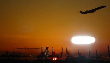 Keywords: Newark airport sunrise looking east.jpg en The sun rises bottom center below the cranes of a nearby seaport while a plane takes off from Newark Airport The bright oval light is a reflection of the camera's flash in the terminal window Looking eastwards 2012-03-08 own Tomwsulcer cc-zero Uploaded with UploadWizard Sunrises of New Jersey Bombardier Canadair Regional Jet Seaports Newark Liberty International Airport |