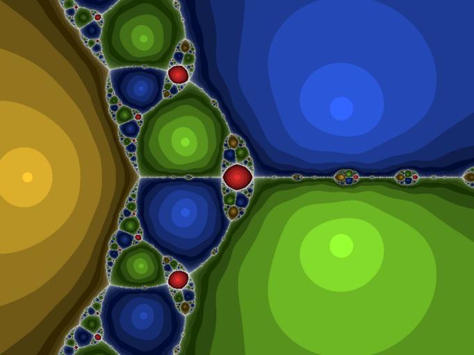 | Keywords: Newton-Fractal 2z3-2z+2.png  Newton fractal for the polynomial <math>f z\mapsto z 3-2z+2</math> in the range -2 2 × -1 5 1 5<math>i</math> Numbers in the orange green and blue basins converge to zeros of <math>f</math> numbers in the red basins are attracted by the attractive cycle <math>\ 0 1\ </math> i e they do not converge to a zero of <math>f</math> The white structure is the Newton fractal for <math>f</math> i e it is the Julia set <math>J</math> for the meromorphic function <math>g z\mapsto z-\frac f z f' z 2\frac z 3-1 3z 2-2 </math> Zeros of <math>f</math> are attractive fixpoints of <math>g</math> Moreover 1 and 0 are fixpoints of <math>g\circ g</math> but not of <math>g</math> The set <math>J</math> has the following properties its interior is empty it is closed <math>\ J \ \mathbb R </math> <math>J</math> is connected <math>J \partial B_\mathrm red \partial B_\mathrm orange \partial B_\mathrm blue \partial B_\mathrm green </math> where <math>\partial B</math> denotes the border of a basin This means that every point in <math>J</math> is a 4-corner point own 2008-03-20 Georg-Johann Lay thumb Closeup using the same color map Newton fractals |