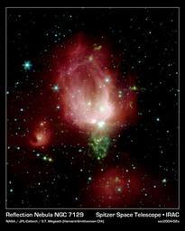 | Keywords: NGC 7129.jpg en A cluster of newborn stars herald their birth in this interstellar Valentine's Day commemorative picture obtained with NASA's Spitzer Space Telescope These bright young stars are found in a rosebud-shaped and rose-colored nebulosity known as NGC 7129 The star cluster and its associated nebula are located at a distance of 3300 light-years in the constellation Cepheus A recent census of the cluster reveals the presence of 130 young stars The stars formed from a massive cloud of gas and dust that contains enough raw materials to create a thousand Sun-like stars In a process that astronomers still poorly understand fragments of this molecular cloud became so cold and dense that they collapsed into stars Most stars in our Milky Way galaxy are thought to form in such clusters The Spitzer Space Telescope image was obtained with an infrared array camera that is sensitive to invisible infrared light at wavelengths that are about ten times longer than visible light In this four-color composite emission at 3 6 microns is depicted in blue 4 5 microns in green 5 8 microns in orange and 8 0 microns in red The image covers a region that is about one quarter the size of the full moon As in any nursery mayhem reigns Within the astronomically brief period of a million years the stars have managed to blow a large irregular bubble in the molecular cloud that once enveloped them like a cocoon The rosy pink hue is produced by glowing dust grains on the surface of the bubble being heated by the intense light from the embedded young stars Upon absorbing ultraviolet and visible-light photons produced by the stars the surrounding dust grains are heated and re-emit the energy at the longer infrared wavelengths observed by Spitzer The reddish colors trace the distribution of molecular material thought to be rich in hydrocarbons The cold molecular cloud outside the bubble is mostly invisible in these images However three very young stars near the center of the image are sending jets of supersonic gas into the cloud The impact of these jets heats molecules of carbon monoxide in the cloud producing the intricate green nebulosity that forms the stem of the rosebud Not all stars are formed in clusters Away from the main nebula and its young cluster are two smaller nebulae to the left and bottom of the central rosebud each containing a stellar nursery with only a few young stars Astronomers believe that our own Sun may have formed billions of years ago in a cluster similar to NGC 7129 Once the radiation from new cluster stars destroys the surrounding placental material the stars begin to slowly drift apart 2004-02-12 http //www spitzer caltech edu/images/1127-ssc2004-02a-Rosebud-of-a-Reflection-Nebula NASA/JPL-Caltech/T Megeath Harvard-Smithsonian CfA Image use policy http //www spitzer caltech edu/info/18-Image-Use-Policy This image is from NASA's Spitzer Space Telescope and was their 2004 Valentine's Day release the cosmic rose More information is available at http //www spitzer caltech edu/Media/releases/ssc2004-02/release shtml PD-USGov NGC 7129 Spitzer space telescope NASA images |