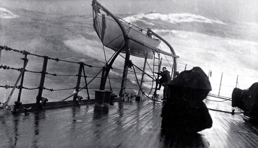 Keywords: blackandwhite monochrome outdoor black and white NH 101060. "Quarter Deck Seas" View looking aft on the main deck of USS Vermont (Battleship # 20), while she was steaming in heavy seas during the Nineteen "teens". Note man standing by the ladder leading to the quarterdeck whaleboat. Photograph by N. Moser, New York. From the album of Francis Sargent; Courtesy of Commander John Condon, 1986. NHHC Photograph Collection. (The Sailor). NH 101060. "Quarter Deck Seas" View looking aft on the main deck of USS Vermont (Battleship # 20), while she was steaming in heavy seas during the Nineteen "teens". Note man standing by the ladder leading to the quarterdeck whaleboat. Photograph by N. Moser, New York. From the album of Francis Sargent; Courtesy of Commander John Condon, 1986. NHHC Photograph Collection. (The Sailor).